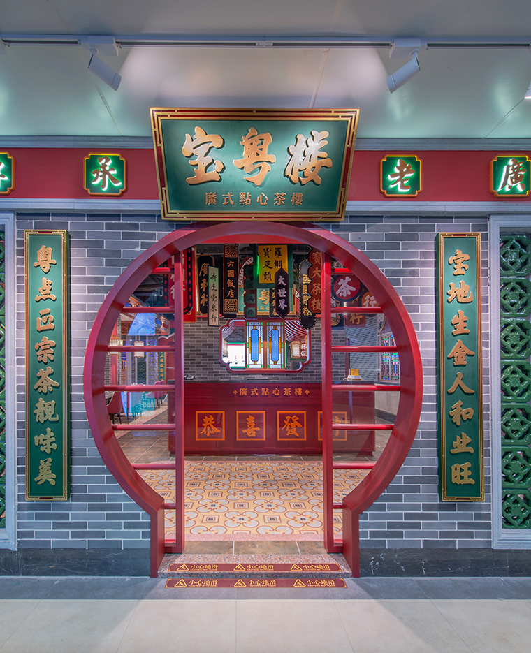 比如在廣州乃至嶺南地區(qū),鑊耳山墻是具有獨特地域文化的一種建筑樣式,完全可以成為一種獨特的品牌傳頌符號。在廣東地區(qū),鑊耳的山墻可擋風入巷,讓風通過門、窗流入屋內(nèi);火災時,高聳的山墻可阻止火勢蔓延和侵入,鑊耳屋象征著官帽兩耳,具“獨占鰲頭”之意,唯有功名的鄉(xiāng)紳方能采用,也是家境殷實的象征。在寶粵樓進門正對的收銀臺,我們就使用了經(jīng)典的鑊耳山墻,讓顧客一眼就能看出廣東特色,感受到西關(guān)文化的味道。