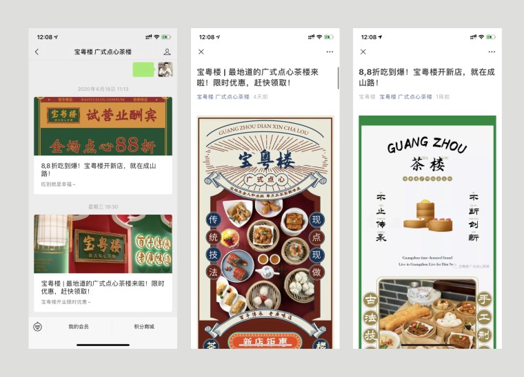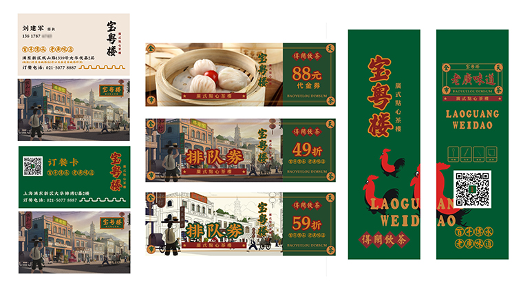 其他的VI如店內(nèi)日常運營的物料系統(tǒng),導視系統(tǒng),推廣廣告系統(tǒng),品深餐飲設計團隊力圖整體空間與品牌完整統(tǒng)一,精細到連顧客接觸最多的墊餐紙、點餐單、使用的功夫茶具、員工的工衣胸牌、圖片的風格,全部統(tǒng)一在寶粵樓的品牌文化體系之內(nèi),給顧客以視覺整齊劃一又靚麗多變的美學感受。