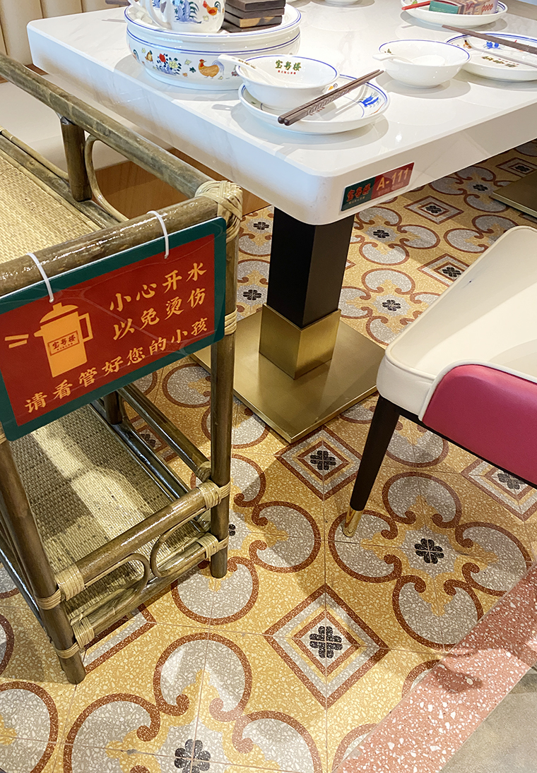 廣式花窗,又稱為滿洲窗。源自于廣州最開始與外國開展海外貿(mào)易,是典型的舶來品。滿洲窗不同的款式和花紋組合體現(xiàn)了使用者的生活富足與審美情趣。廣式花窗可以很好的表現(xiàn)廣式點心茶樓的品類屬性,具有一目了然,一見如故的特性。在寶粵樓的空間設計中,我們將廣式花窗大面積使用門口兩側(cè)的主形象,包房隔斷、甚至天花吊頂上,形成了強烈的視覺沖擊力,具有鮮明的老廣州西關(guān)韻味。