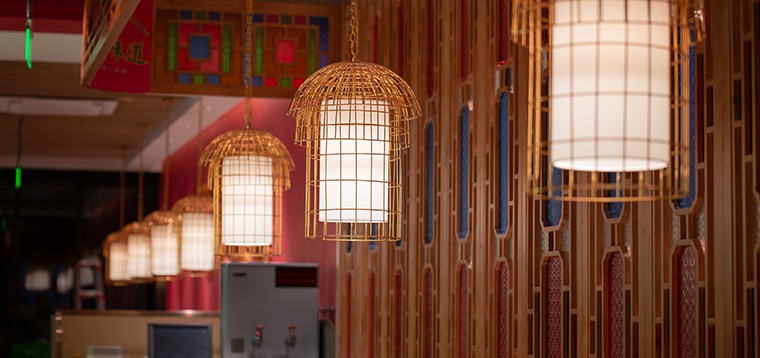 此次寶粵樓的空間軟裝陳列設計,涵蓋了餐桌餐椅、收銀臺、服務臺、收納柜、沙發(fā)坐具等餐飲家具;空間吊燈及照明裝飾設計;裝飾品、雕塑擺件、工藝品、畫藝軟裝以及最重要的品牌定制裝置軟裝。家具的主色調(diào)與品牌的主色調(diào)保持一致,椅子的款型也選用了廣州西關(guān)老式茶樓中的椅子;我們所使用的吊燈模仿鳥籠造型就是為了傳遞廣州老茶客提籠遛鳥飲早茶的悠閑幸福生活,和整個品牌文化高度契合;