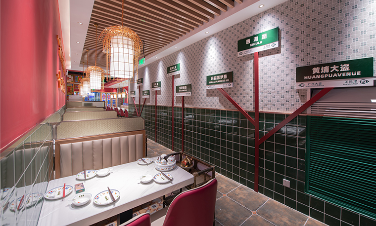 廣州老建筑的趟門,西關(guān)大屋具有鮮明的地域特色,很好展現(xiàn)了廣府人的生活智慧。空間中涉及到門的地方,我們都使用了西關(guān)趟門,柵欄隔斷,廣式生活濃厚,趣味盎然。尤其是正面主入口圓形門洞再配上西關(guān)趟門,識別度極高,讓消費者有一種迫切想進來一探究竟的沖動。