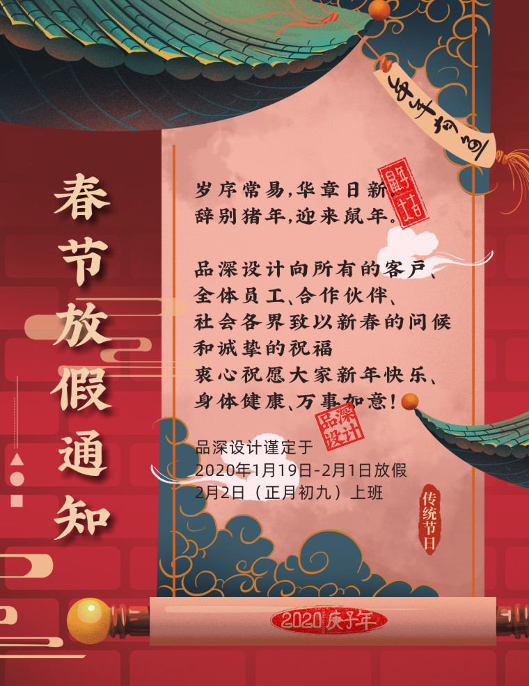 品深設(shè)計(jì)謹(jǐn)定于2020年1月19日(臘月25)正式放假,2月2日(正月初九)上班。