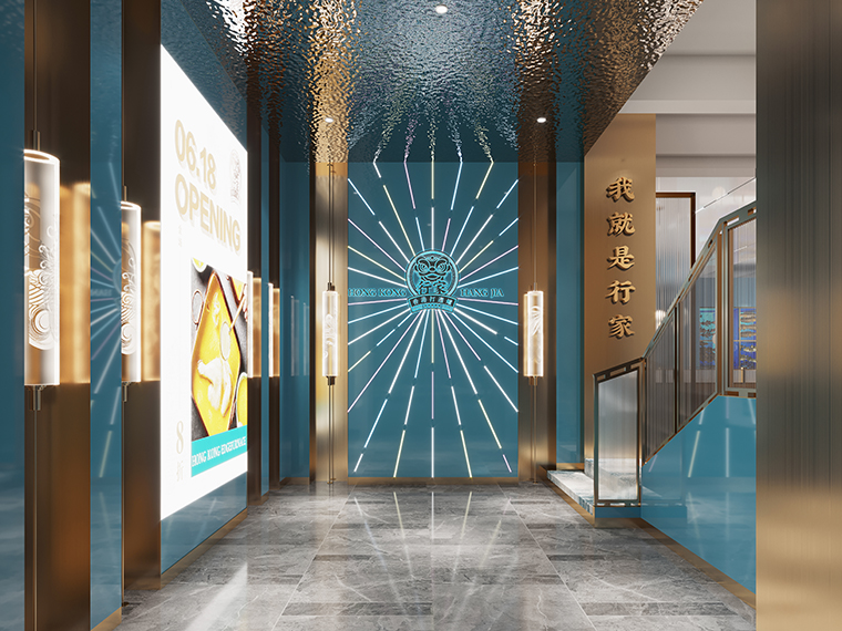 餐廳的主入口處,人流最密集之地,也是品牌首選的亮相之處。展現品牌主形象LOGO,以香港常見的霓虹燈材質,四周放射性線條,極具識別度,既有鮮明的港式風格,又能吸引消費者打卡拍照分享;上樓梯處再用不銹鋼金屬字強調品牌名字“我就是行家”;1樓大廳一整面墻的香港城市景色照片,讓消費者有一種身臨其境的感受;二樓大廳正面形象墻以行家牌匾+立體浮雕醒獅,最經典的港式匾額傳達花膠雞悠久厚重的歷史,兩側喜慶的南派醒獅,吉祥又可愛,與品牌LOGO彼此呼應。