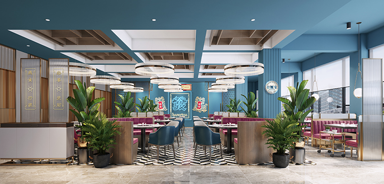 根據行家港式火鍋的品牌定位,我們餐廳的整體氛圍應該輕奢且品質感很強;熱鬧卻不喧囂,精致有特色但容易讓人親近!整個餐廳的色彩以暖色調的不銹鋼金色為主,凸顯火鍋的用餐熱鬧,同時也讓顧客更容易親近,柜體運藍色表達出鮮明的港式風格,同時也點明我們海鮮火鍋的特色。