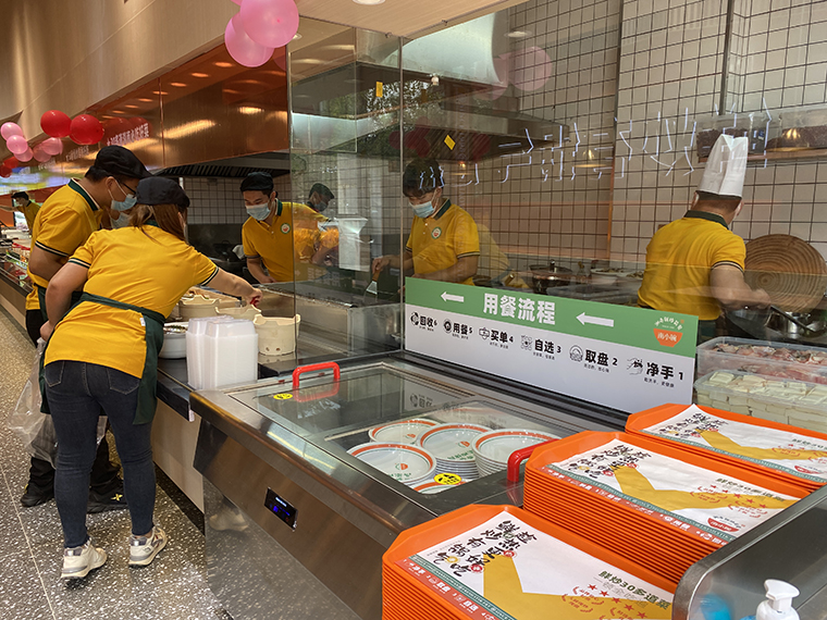 1、餐廳功能設計,不追求座位數,而是充分滿足后廚運轉效率。整個餐廳遵循前廳與后廚6:4的面積配比,后廚運轉的空間夠大,空間收納整齊,廚師工作效率更高。廚房設置在入門口,全透明廚房,顧客遠遠就看得見廚師在炒菜,現炒新鮮看得見。顧客進門洗手,取餐盤自助選菜,找位置就餐,餐具回收,整個動線非常流暢。動線設計非常驚艷,30多到菜品讓消費者產生一種想全部吃一遍的沖動,進而胃口大開,長期光顧我們。