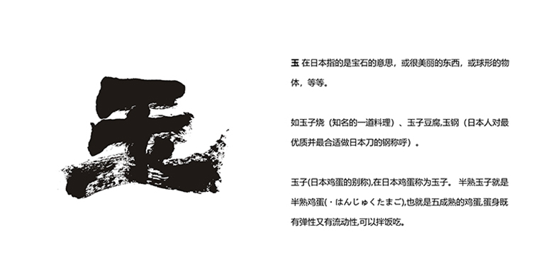玉”在日本指的是寶石的意思,或很美麗的東西,或球形的物體等等。如玉子(日本雞蛋的別稱),半熟玉子就是半熟雞蛋(はんじゅくたまご),也就是五成熟的雞蛋,蛋身既有彈性又有流動(dòng)性,可以拌飯吃。玉子燒(知名的一道料理),玉子豆腐,玉鋼(日本人對(duì)最優(yōu)質(zhì)并最合適做日本刀的鋼的美稱)。